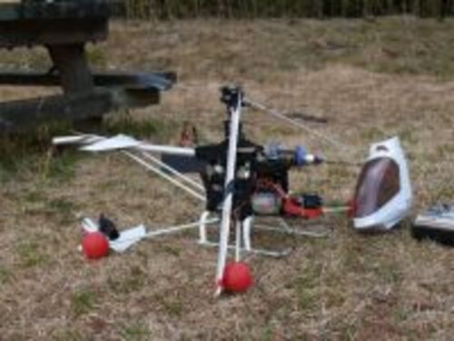 墜落したラジコンヘリの被害状況を確認。テールブームがぐにゃぐにゃにねじ曲がり、タイミングベルトが引きちぎれ、テールユニットケースが割れ、スタビライザーも曲がっていました。メインブレードは折れてはいないものの、コーティングが剥がれてしまった…