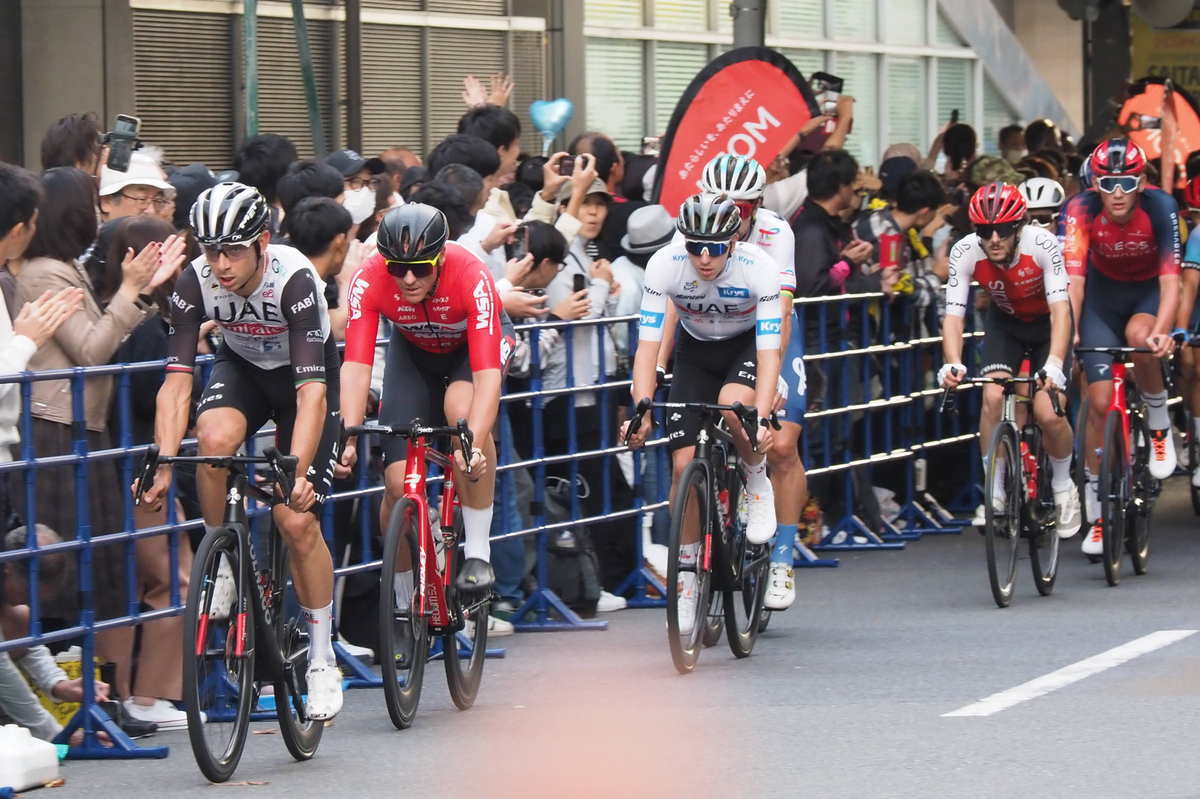 ツール・ド・フランスを走った選手を間近で見られる貴重な機会。豪華なワールドチームの集団が駆け抜けます。
