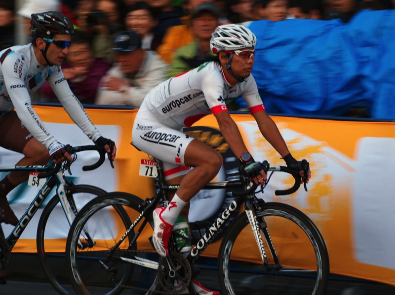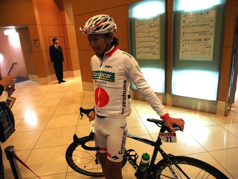 日本チャンピオンの新城幸也(ユーロップカー)。この夏ツール・ド・フランスを走った日の丸ジャージです。ヨーロッパで活動している選手なので、このジャージは日本初披露。